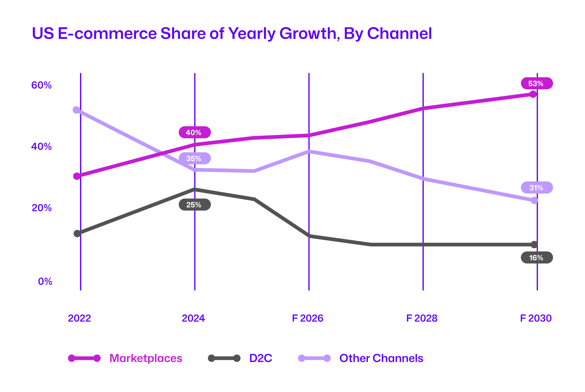 Marketplaces are not only extremely popular with consumers currently—they’re gaining momentum. By 2030, marketplaces are projected to deliver over 50% of the growth in the U.S. e-commerce sector, solidifying their dominance in the digital retail landscape.